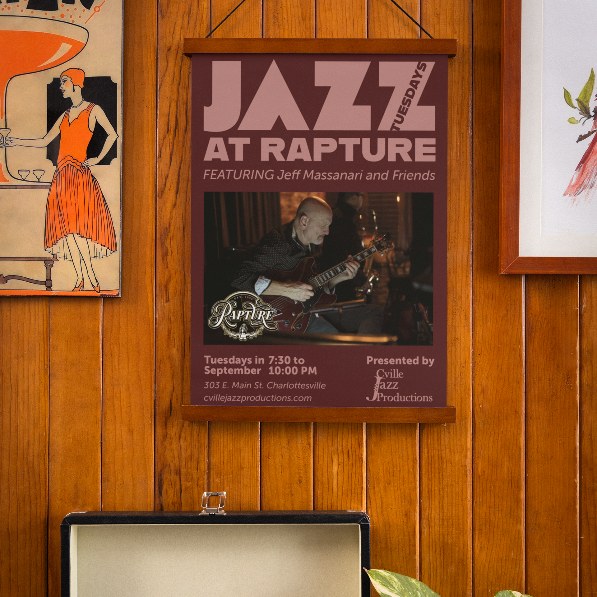 I also created a series of posters for CVille Jazz Productions. Jazz Tuesdays is hosted by CVille Jazz Productions. Jazz Tuesdays showcases a variety of jazz showcases at the Rapture Restaurant in Charlottesville, Virginia. For these events, a poster was needed to capture the essence of the performances and entice locals to join in on the fun!